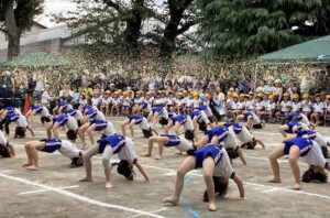 年長組の組立体操。小さな時から憧れの眼差しを持ってみてきました。いよいよ、自分たちの出番です!腕が痛くて、崩れる時もありました。友だちと心を合わせないと成功しないことも知りました。
