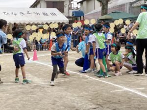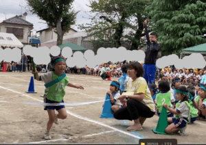 年長のクラス全員リレー。これも運動会の花形といえる競技でしょう。毎日毎日、自由遊びの時間もバトンを握りしめ、仲間と共に走り、つなげ、認め合い、応援し合ってきました。