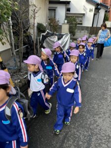 秋の爽やかな青空の下、年少組は『歩き』で近くの公園までお散歩遠足をしました。年少組さんにとっては、先生と友だちと『お散歩』にいくのは初めての経験です。門を出て、しばらくは緊張の面持ちで歩いていました。