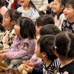 作った《ふしぎないきもの》(封筒人形)を手にして、先生と即興のお話遊びで遊ぶ子どもたち。言葉も表現も豊かな《ものがたり》が広がります。